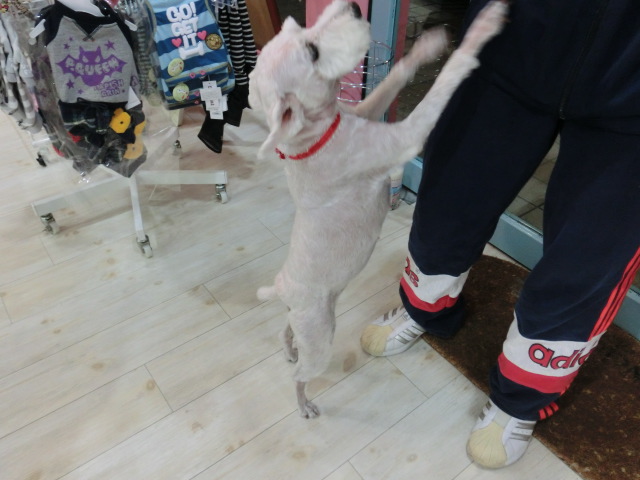 早く帰りたくて、 ドアの前でシッポを振るレディちゃん
