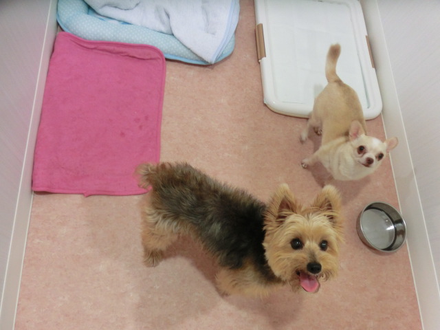 チャッピー君、 キャリーの中へ、 ミルちゃんはベッド emoji
