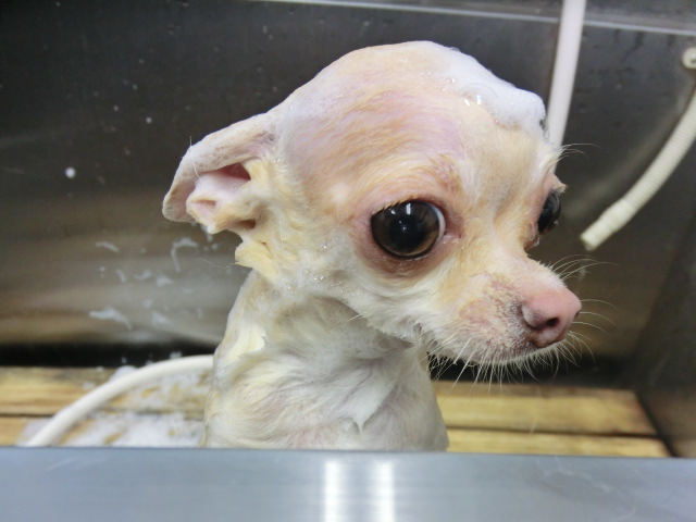小っちゃなチワワの らんちゃん、 シャンプーして とっても綺麗になりました シャンプー中 とってもいい子で頑張ってくれた らんちゃんでした
