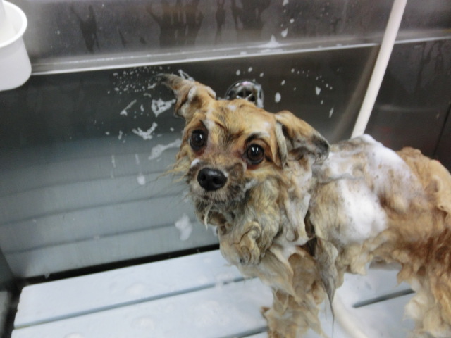 元気君、 抜け毛をしっかりとって、 シャンプー